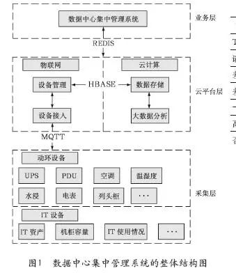 本係統(tǒng)主要分三(sān)個層,采集層、雲平台層、業務層。其中采集層主要是(shì)由UPS、PDU、電表、溫濕度等動環設備與IT資產(chǎn)采集設(shè)備組(zǔ)成;雲平台層(céng)主要是存儲設備數據以(yǐ)及進行大數據分析;業務層則(zé)是展示給用戶的數據中心(xīn)集中管理係統。整體架構如圖(tú)1所示。