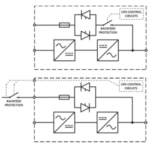 重要的是要理解,包括半導體和晶閘管的靜態開關以及相關聯的控製(zhì)和緩衝電路可能不能為上遊電(diàn)氣網絡的安全維護提供足夠的隔離,即使其正如企(qǐ)業所預期的那樣工作。當靜態開關晶閘管的門極信號(gate signal)關閉並且不通過電源時,電路可(kě)能會在上遊(yóu)泄漏一些電壓和電(diàn)流,其(qí)足以對人員造成危害。因此,反向饋電保護主要是在正常運行條件下用於UPS係統,而不僅僅是(shì)經常被認為的故(gù)障情況。
